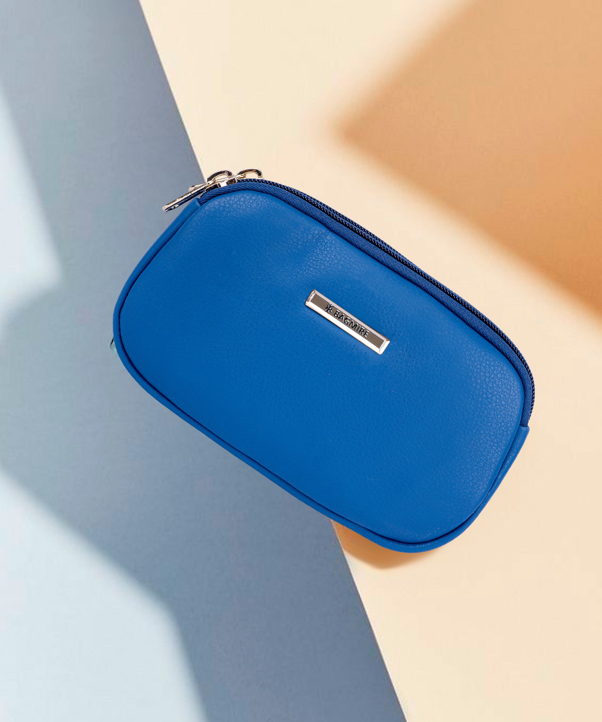 The Bagmire Women's Double-Zip Pouch in royal blue is a multifunctional organizer made from faux leather. It features a sleek design with two separate zip compartments, providing ample space to keep essentials like cosmetics, cards, cash, or small accessories neatly organized. This pouch is compact yet spacious enough for daily use, combining style and practicality with its durable material and vibrant royal blue color.