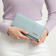 The Bagmire Women's PU Leather Clutch Wallet in mint green features textured faux leather for a stylish and durable finish. This card holder purse is designed with multiple compartments to neatly organize cards, cash, and small essentials. Its compact and lightweight design makes it perfect for everyday use, easily fitting into handbags or carrying alone as a chic accessory. The elegant mint green color adds a fresh and modern touch to this practical wallet.
