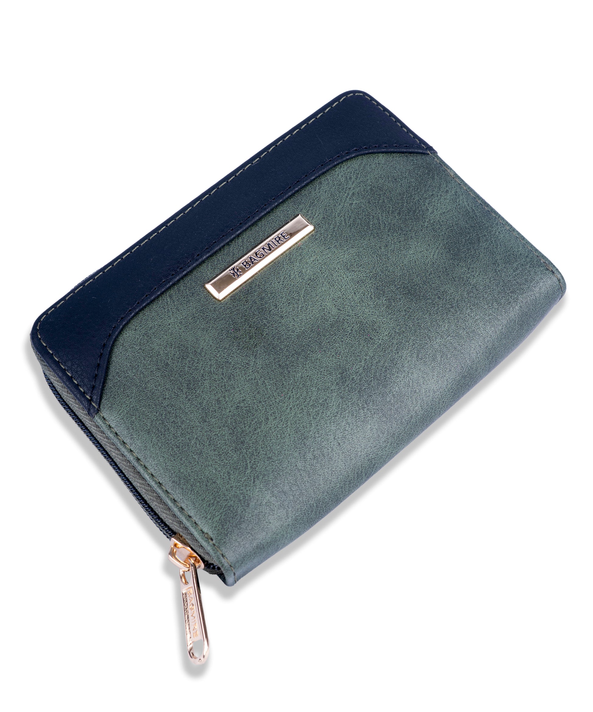 The Bagmire Women's Small Wallet is a dual-tone zip-around mini purse crafted from high-quality PU leather, featuring a stylish combination of slate green and navy colors. This compact wallet is designed to be both fashionable and functional, offering organized storage for cards, coins, and cash with its secure zip closure. Its lightweight and slim profile make it perfect for everyday use, easily fitting into handbags or pockets while providing a chic accessory option.